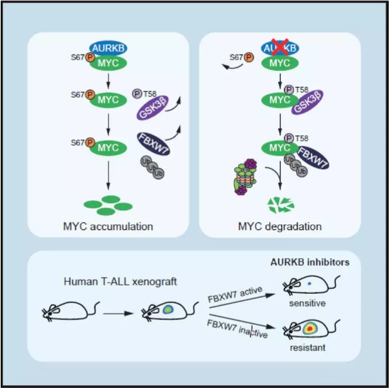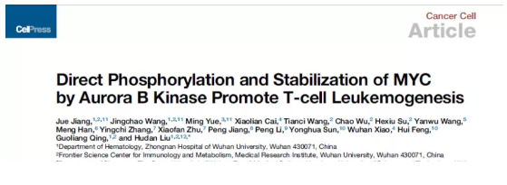 2 月 10 日,伯豪生物復(fù)工的首天,我們接到了來(lái)自武漢的好消息,我們的客戶(hù)武漢大學(xué)醫(yī)學(xué)研究院劉胡丹教授團(tuán)隊(duì)在 Cancer Cell(IF 23.9)上發(fā)表了題為“Direct Phosphorylation and Stabilization of MYC by Aurora B Kinase Promote T-cell Leukemogenesis”的重大研究成果,報(bào)道了 AURKB-MYC 正反饋調(diào)控軸在急性 T 淋巴細(xì)胞白血病(T-ALL)的發(fā)生發(fā)展中起著重要作用,間接干預(yù) MYC 是治療 T -ALL 的潛在新策略。