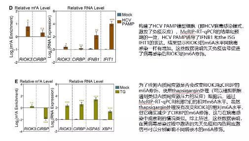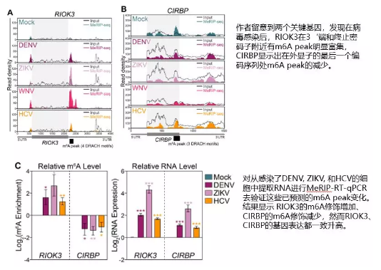 作者發(fā)現(xiàn)被黃病毒科(DENV 登革熱病毒、ZIKV 寨卡病毒、WNV 西尼羅河病毒 &HCV 丙型肝炎病毒)病毒感染后,細胞中 mRNA 的 m6A 修飾會發(fā)生改變,包括 RIOK3 和 CRRBP。在病毒感染期間,RIOK3 的 m6A 修飾會促進其轉錄,然而 CIRBP 的 m6A 修飾丟失會促進其轉錄本剪切編輯。作者還發(fā)現(xiàn)病毒感染引起的免疫應答激活或內(nèi)質網(wǎng)應急反應分別有助于 RIOK3 和 CIRBP 的 m6A 修飾。同樣 m6A 修飾發(fā)生改變的一些轉錄本,包括 RIOK3 和 CIRBP 等編碼蛋白會也影響病毒感染??偠灾?,這項工作揭示了病毒感染期間激活的信號通路會導致宿主 mRNAs 的 m6A 修飾變化進而調控感染,說明發(fā)生 m6A 修飾的 mRNA 轉錄后調控會潛在影響病毒復制。