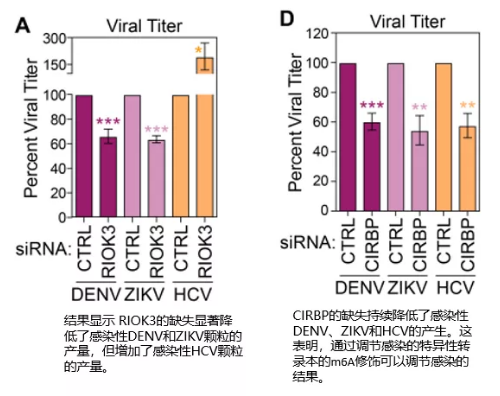 作者在 RIOK3 和 CIRBP 轉錄本都改變了 m6A 的修飾后,為探究其編碼的蛋白產(chǎn)物是否影響黃病毒科感染,使用小干擾 RNA (siRNA) 敲低了 Huh7 細胞中的 RIOK3 和 CIRBP 表達,用 DENV、ZIKV 或 HCV 感染這些細胞,然后在感染后 72 小時后的上清液中測量病毒滴度。