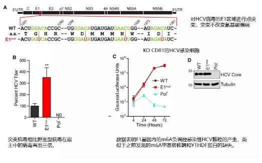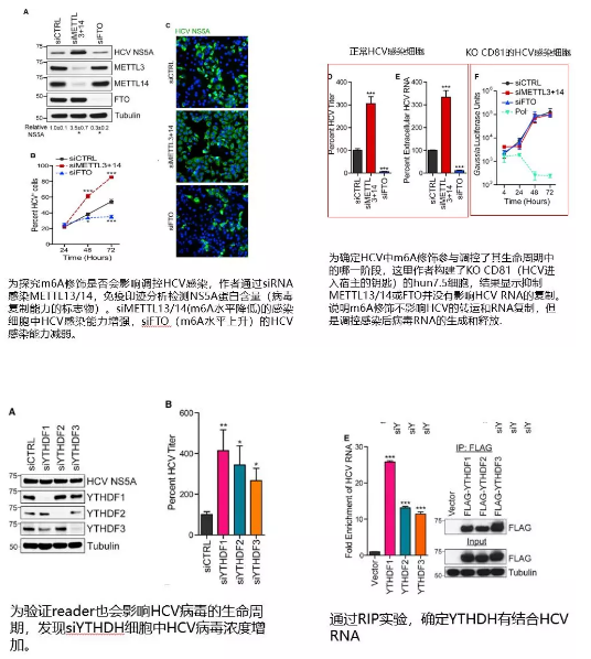 Stacy M. Horner 教授首先通過上述實驗對 m6A 修飾在病毒本身生命周期的作用探究后,確定了 m6A 甲基轉移酶負調控感染性 HCV 顆粒的產(chǎn)生,同時 m6A 結合的 YTHDF 蛋白均重新定位于 HCV 顆粒產(chǎn)生的位點,并抑制病毒感染的這一階段。數(shù)據(jù)顯示 m6A 修飾的改變調節(jié) HCV 感染,并為在更廣泛的黃病毒科病毒家族中探究 m6A 的功能奠定了基礎。
