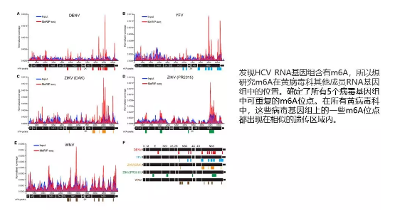作者在本文描述了 m6A 修飾在 HCV 病毒生命周期中的調控作用,證明了 m6A 甲基轉移酶負調控感染性 HCV 顆粒的產(chǎn)生,m6A 結合的 YTHDF 蛋白重新定位于 HCV 顆粒產(chǎn)生的位點,并抑制病毒感染的這一階段。抑制 m6A 修飾會增強病毒滴度,增加 HCV RNA 與 HCV 核心蛋白的相互作用。描述了其他幾種黃病毒科的 m6A 修飾情況,包括 ZIKV, DENV, WNV,和 YFV??傊?,數(shù)據(jù)顯示 m6A 修飾調節(jié) HCV 感染,并為更深入的探究 m6A 在黃病毒科病毒家族中的功能奠定了基礎。值得一提的是,文章中的病毒基因組并不是單獨提取得到,而是與宿主細胞一起提取出 total RNA,再進行 MeRIP-seq,分別與宿主和病毒基因組進行比對,從而得到病毒基因組上 m6A 整體修飾情況。