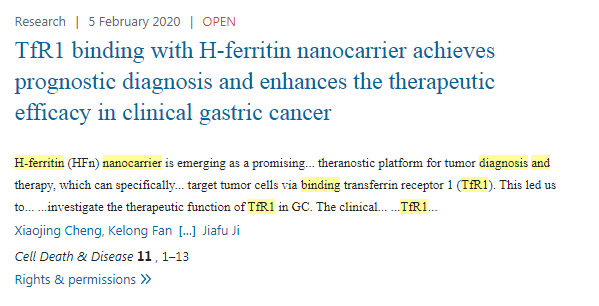TfR1 與鐵蛋白抗原納米載體綁定實(shí)現(xiàn)了臨床上胃癌預(yù)后診斷并增強(qiáng)治療的功效