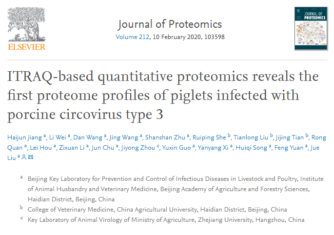 豬環(huán)狀病毒 3 型(PCV3)感染導(dǎo)致豬皮炎和腎病綜合征、繁殖失敗、以及仔豬和母豬的多系統(tǒng)炎癥損傷。為了更好地了解宿主對 PCV3 感染的反應(yīng),我們采用相對和 jué對定量(iTRAQ)等壓標(biāo)記結(jié)合 LC-MS/MS 技術(shù),對 PCV3 感染 4 周后無病原仔豬肺內(nèi)差異調(diào)節(jié)的細(xì)胞蛋白進(jìn)行了定量測定。在 PCV3 感染組與對照組中,三次獨(dú)立質(zhì)譜共檢測到 3429 個(gè)蛋白,其中 242 個(gè)差異性細(xì)胞蛋白被顯著調(diào)控,PCV3 感染組比對照組上調(diào) 100 個(gè)蛋白,下調(diào) 142 個(gè)蛋白。生物信息學(xué)分析表明,這些高豐度或低豐度蛋白質(zhì)主要涉及代謝過程、先天免疫應(yīng)答、MHC- I 和 MHC-II 組分以及吞噬體途徑。通過實(shí)時(shí) RT-PCR 技術(shù)篩選出 10 個(gè)編碼差異調(diào)節(jié)蛋白的基因。免疫印跡和免疫組化進(jìn)一步證實(shí)了 6 種代表性蛋白 OAS1、Mx1、ISG15、IFIT3、SOD2 和 HSP60 的表達(dá)水平。本研究嘗試?yán)?iTRAQ 技術(shù)研究 PCV3 感染仔豬的蛋白質(zhì)譜,為更好地了解豬 PCV3 感染宿主反應(yīng)的機(jī)制提供了有價(jià)值的信息。意義:我們的研究鑒定了與 PCV3 感染仔豬肺部多種潛在信號(hào)通路相關(guān)的差異豐富的蛋白質(zhì)。這些發(fā)現(xiàn)為更好地了解宿主對 PCV3 感染的反應(yīng)機(jī)制提供了有價(jià)值的信息。