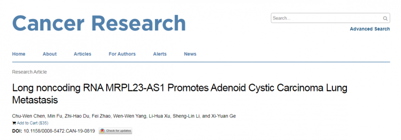 Long noncoding RNA MRPL23-AS1 Promotes Adenoid Cystic Carcinoma Lung Metastasis