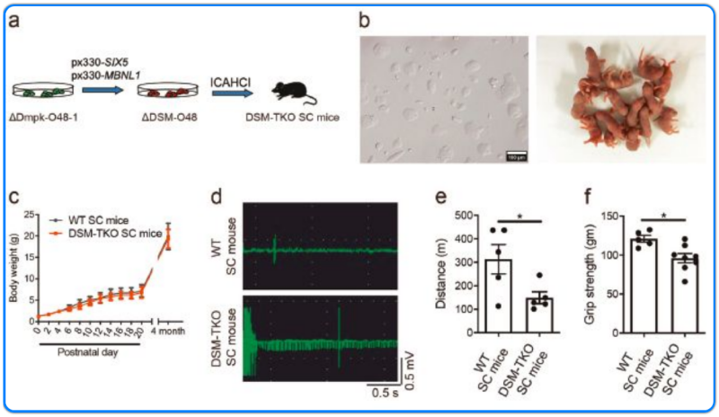研究人員首先通過半克隆技術(shù)結(jié)合 CRISPR/Cas9 基因編輯技術(shù),成功構(gòu)建了 Dmpk、Six5 和 Mbnl1 雜合突變的孤雄單倍體胚胎干細(xì)胞(AG-haESCs),并通過 ICAHCI 技術(shù)注入卵子進(jìn)而一步獲得 Dmpk、Six5 和 Mbnl1 三基因雜合突變的半克隆小鼠模型。全基因組測序分析結(jié)果顯示沒有脫靶效應(yīng),表型分析顯示該半克隆小鼠產(chǎn)生了肌無力、肌萎縮、嚴(yán)重運(yùn)動(dòng)障礙、呼吸和消化功能紊亂等典型的 DM1 表型,但沒有先天性 DM1(CDM)的表型,提示其他基因的劑量變化可能與此相關(guān)。