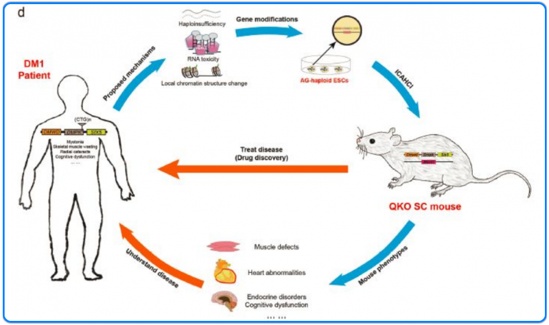 該研究開發(fā)了一種新策略,通過半克隆技術(shù)快速構(gòu)建多基因雜合突變小鼠模型來模擬 DM1 的多數(shù)表型,一定程度上證明了 Dmpk 中 CTG 重復(fù)序列的異常擴(kuò)增會導(dǎo)致多個(gè)基因表達(dá)水平下調(diào)從而誘發(fā) DM1 的復(fù)雜病理表型,這些模型的建立為深入研究 DM1 的發(fā)病機(jī)理和進(jìn)行藥物篩選奠定了基礎(chǔ)。