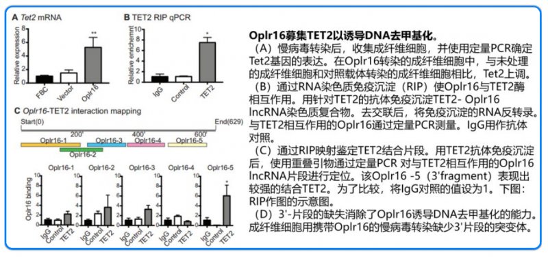 啟動子甲基化分析檢測 Osclr8 對 Oct4 啟動子甲基化是否有保護作用,另通過 RT-PCR 方法檢測重編程過程中 3 種 TET 的表達,應用 lncRNA 染色質(zhì)免疫共沉淀方法檢測 TET 蛋白是否與 Oplr16 結(jié)合明確 lncRNA Oplr16 與 TET 結(jié)合片段。