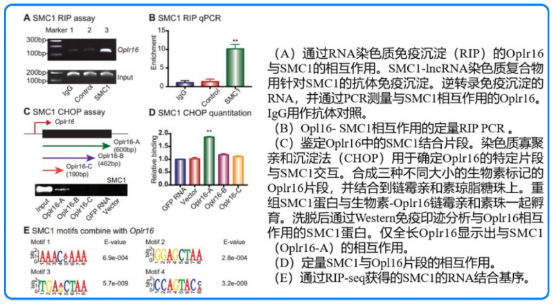 研究團隊先前已發(fā)現(xiàn)了啟動子 - 增強型染色體內(nèi)環(huán)結(jié)構,對于啟動和維持干細胞多能性至關重要。本研究也使用染色質(zhì)構象捕獲(3C)的方法驗證 Oplr16 是否參與該染色質(zhì)內(nèi)環(huán),結(jié)果檢測到 E14 細胞的多能性相關 3C 環(huán),但敲除 Oplr16 可以改變這種染色體內(nèi)環(huán)結(jié)構。使用 SMC1 RNA 染色質(zhì)免疫沉淀(RIP)分析 Oplr16 與 SMC1 相互作用。