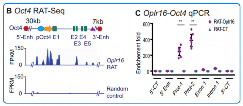 使用 RNA 逆轉(zhuǎn)錄相關陷阱測序(RAT-seq)方法來分析 Oplr16 的靶基因。分析顯示 Octr16 在 Oct4 基因座富集,在啟動子區(qū)域有一個峰,對照大鼠在該基因座處未顯示結(jié)合峰。定量 PCR 也顯示 Oplr16 在 Oct4 的啟動子區(qū)域富集。