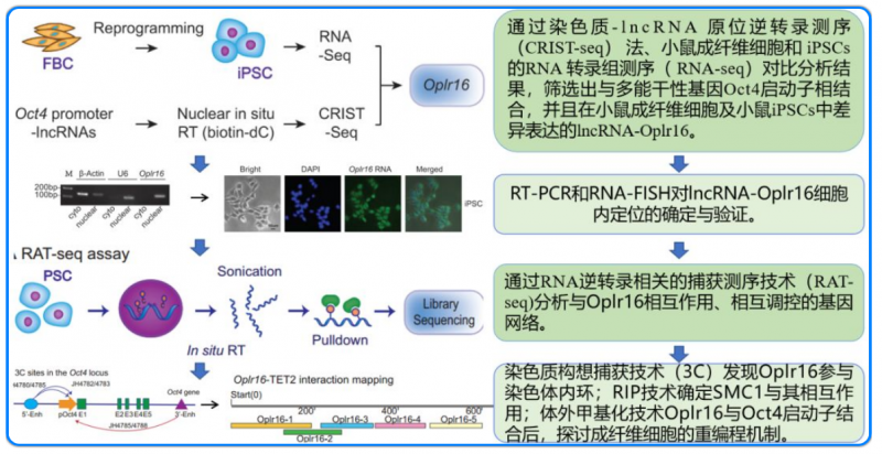 潛在的多能性相關的 lncRNA 應滿足兩個標準能力,首先,具有調(diào)節(jié)干細胞核心因子基因例如 Oct4,Sox2 和 Nanog 的能力。其次,響應多能性狀態(tài)而差異表達。本文作者提出了一種新穎的策略來尋找滿足這兩個標準的潛在 lncRNA。使用染色質(zhì) RNA 原位逆轉(zhuǎn)錄測序(CRIST-seq)方法確定哪些 lncRNA 與 Oct4 啟動子相互作用,然后使用常規(guī)的 RNA 轉(zhuǎn)錄組測序(RNA-seq)來鑒定可能與多能性重編程相關的差異表達的 lncRNA。RNA-seq 用于鑒定在重編程過程中收集的成纖維細胞和 iPSC 之間差異表達的 RNA。進一步鑒定  Oplr16 是多能性相關的 lncRNA。作者分離了細胞質(zhì)和核 RNA 進行亞細胞分級測定。RT-PCR 顯示,Oplr16 主要位于細胞核中(圖 1C)。RNA-FISH 分析也驗證了其在 iPSC 中的核定位(圖 1D)。這些結(jié)果表明 Oplr16 是在體細胞重編程過程中被激活的小鼠核 lncRNA。