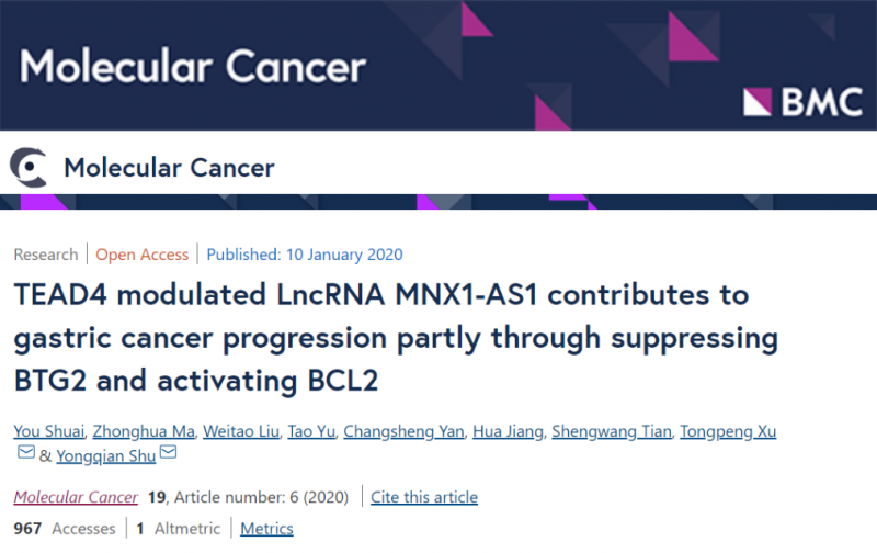 該文章是 2020 年 1 月南京醫(yī)科大學(xué)附屬第一醫(yī)院的研究團(tuán)隊發(fā)表在 Molecular Cancer(IF=10.68)雜志上的,文章標(biāo)題為“TEAD4 modulated LncRNA MNX1-AS1 contributes to gastric cancer progression partly through suppressing BTG2 and activating BCL2”。文章研究發(fā)現(xiàn)受轉(zhuǎn)錄因子 TEAD4 表達(dá)調(diào)控的 lncRNA MNX1-AS1 可以通過抑制靶基因 BTG2 的表達(dá)來參與調(diào)控胃癌進(jìn)展,同時 MNX1-AS1 可以通過 ceRNA 調(diào)控機制激活 BCL2 的表達(dá)來參與調(diào)控胃癌進(jìn)展。區(qū)別于常規(guī)的在一篇文章里只進(jìn)行一種 lncRNA 作用模式研究,該文同時進(jìn)行了兩種,而且數(shù)據(jù)分析透徹,實驗內(nèi)容充足,小伙伴們可以學(xué)習(xí)起來哦。