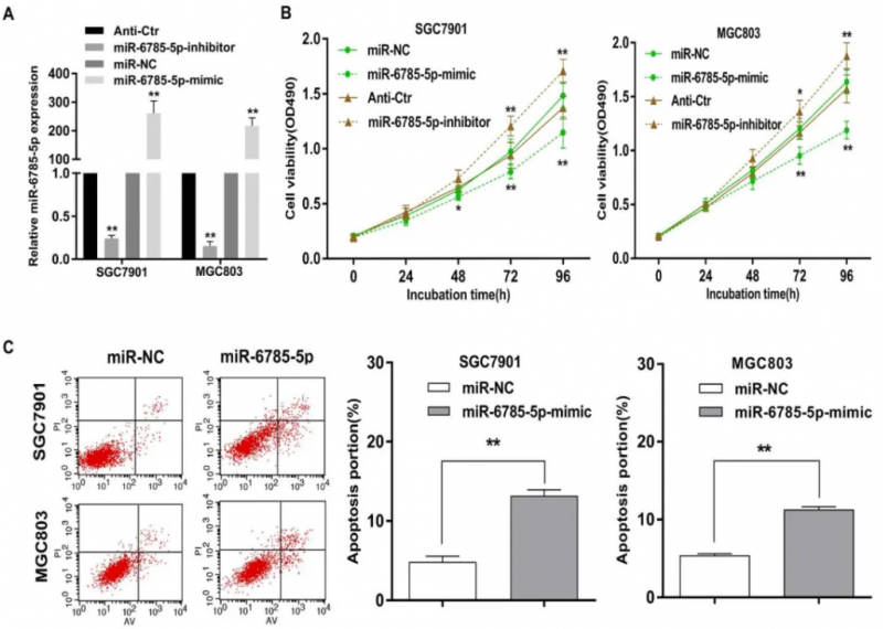 BCL2 是 miR-6785-5p 的靶點,被 MNX1-AS1 缺失所抑制。a. 使用 qRT-PCR 檢測轉(zhuǎn)染了 miR-6785-5p mimic 或 miR-6785-5p 抑制劑的 GC 細(xì)胞中的 miR-6785-5p,并與對照組比較。b. 采用 MTT 法研究 miR-6785-5p 表達(dá)改變對 GC 中細(xì)胞活力的影響。c. SGC7901 和 MGC803 細(xì)胞進(jìn)行細(xì)胞凋亡染色分析。隨著 MNX1-AS 基因的下調(diào),BCL2 在 GC 細(xì)胞中的表達(dá)水平明顯降低。e. qRT-PCR 檢測 miR-6785-5p 調(diào)節(jié)異常對 SGC7901 和 MGC803 細(xì)胞 BCL2 表達(dá)的影響。f. 推測 miR-6785-5p 在 WT 和 BCL2 的 Mut 3’UTR 中的靶向位點的預(yù)測結(jié)果。MiR-6785-5p 可以與 BCL2 mRNA 的 3'UTR 中的預(yù)測位點結(jié)合。g. Western blot 檢測結(jié)果顯示,miR-6785-5p 過表達(dá)可損害 MNX1-AS1 過表達(dá)介導(dǎo)的 BCL2 上調(diào),而抑制 miR-6785-5p 可降低 MNX1-AS1 敲低誘導(dǎo)的 BCL2 下調(diào)