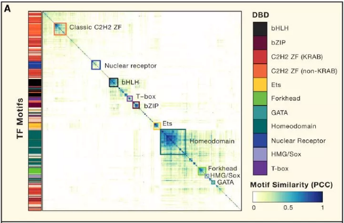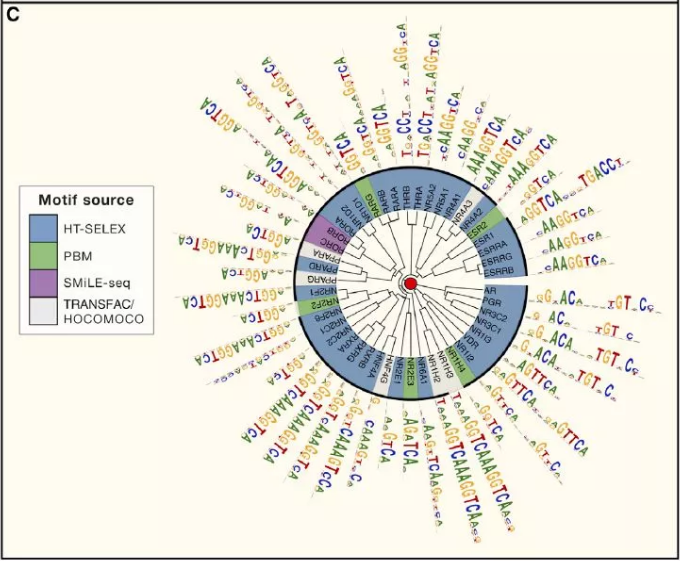 許多 TF 識(shí)別相似的 motif,通常對(duì)應(yīng)到 TF 家族或亞家族,這個(gè)現(xiàn)象與許多先前的研究一致(圖 2A)。值得注意的是,C2H2-ZF 蛋白為 motif 中多樣性的(圖 2B),這與先前所研究得結(jié)構(gòu)和 DNA 接觸殘基的多樣性一致。圖 2C 顯示的是 NHR 家族的 motif,說明轉(zhuǎn)錄因子多樣性涉及單體 DNA 序列偏好和蛋白質(zhì)復(fù)合物形成的變化。圖 2C 中的許多 motif 被二聚體識(shí)別。在人體中總共有超過 500 個(gè)特異性的 motif,表明廣泛的 DNA 序列可以作為轉(zhuǎn)錄因子結(jié)合位點(diǎn)。