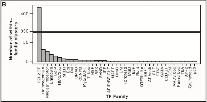 當(dāng)前的 TF 列表可能仍然不完整,完整的 DBD 系列可能仍然未被完全發(fā)掘。實(shí)際上,由于缺乏規(guī)范的 DBD,此列表中的 69 個(gè) TF 被歸類為“unknown family”。大多數(shù)這些蛋白質(zhì)缺乏 motif(見下文),晶體結(jié)構(gòu)基本上是無法獲得的,并且與 DNA 結(jié)合的證據(jù)僅包括在單個(gè)文庫中鑒定的少數(shù)序列。因此,在獲得更多實(shí)驗(yàn)數(shù)據(jù)結(jié)果前,應(yīng)謹(jǐn)慎對(duì)待此類別的 TF。