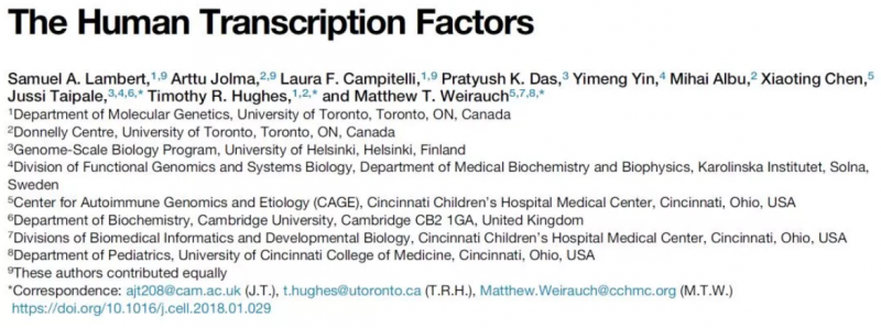 Lambert SA, Jolma A, Campitelli LF, Das PK, Yin Y, Albu M, Chen X, Taipale J, Hughes TR, Weirauch MT. The Human Transcription Factors. Cell. 2018;175:598–9.
