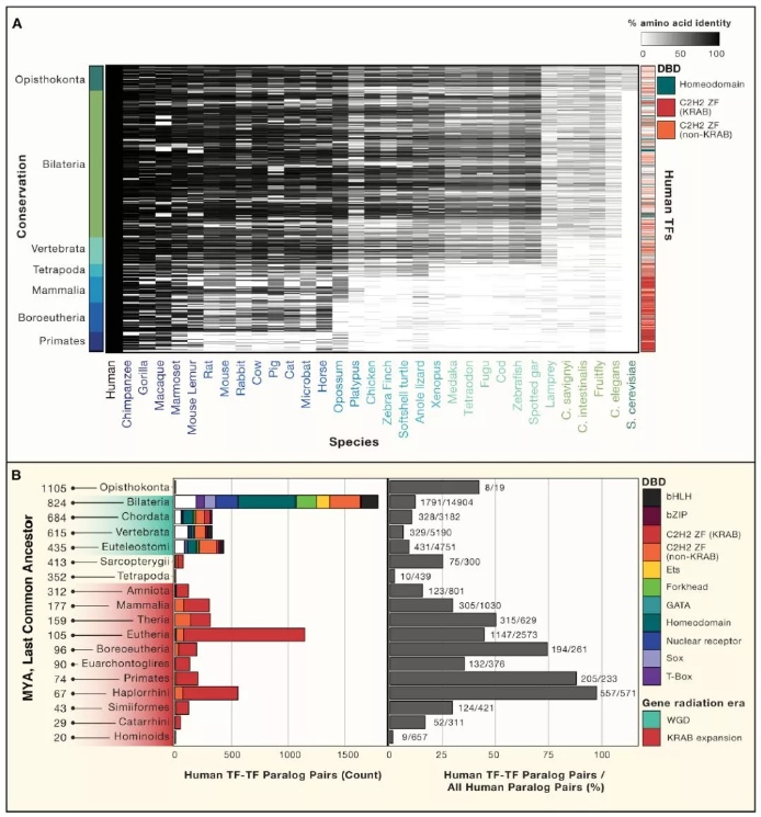 轉(zhuǎn)錄因子的演變通常比它們的調(diào)控位點(diǎn)的演變慢得多。人和果蠅之間的轉(zhuǎn)錄因子直系同源物通常顯示出幾乎相同的序列特異性。盡管如此,轉(zhuǎn)錄因子確實(shí)在不斷進(jìn)化,它們的 motif、結(jié)合物和表達(dá)模式都在不停地改變著。人類轉(zhuǎn)錄因子中不變與改變中的一個(gè)突出例子便是大多數(shù)哺乳動(dòng)物基因組編碼了數(shù)百種含有 KRAB 的 C2H2-ZF 蛋白,其中許多都顯示出了多樣化選擇的標(biāo)志,在人和小鼠之間也具有復(fù)雜的直系同源模式。在人類中,KRAB C2H2-ZF 蛋白通常都與轉(zhuǎn)座子(TEs)(主要是 LINE 和內(nèi)源性逆轉(zhuǎn)錄病毒)結(jié)合,在初期可能是通過抑制 KRAB 結(jié)構(gòu)域的功能使它們沉默。轉(zhuǎn)座子和轉(zhuǎn)錄因子之間的“軍事競賽”為其迅速而又多樣化的變化做出了很好的解釋。
