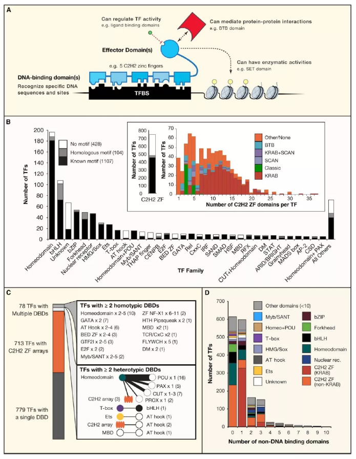 記錄的 1,639 個(gè)已知或潛在的人類轉(zhuǎn)錄因子,其中大多數(shù)至少包含了兩種 DBD 類型中的一種(C2H2-ZFs 和 Homeodomains)。剩下近一半(46%)是另外六個(gè) bHLH、bZIP、Forkhead、核激素受體、HMG / Sox 和 ETS(圖 1B)。在考慮了缺乏 DNA 序列特異性的已知亞類后,含有 Myb / SANT 和 HMG 結(jié)構(gòu)域的 TF 比先前估計(jì)的少得多。1,639 個(gè) TF 中的大多數(shù)(93%)或作為單體與 DNA 結(jié)合或作為同源多聚體與 DNA 結(jié)合。且許多都包含相同 DBD 類型的多拷貝(圖 1C),但其中大多數(shù)是 C2H2-ZF,它們與 DNA 按列結(jié)合(圖 1A)。每種蛋白質(zhì)的 C2H2-ZF 數(shù)量變化很大,一定程度上取決于效應(yīng)結(jié)構(gòu)域(圖 1B)。含有 KRAB 的亞型中的大量 C2H2-ZF 可能是由于靶向單個(gè)轉(zhuǎn)座子所需的特異性。只有一小部分 TF(47 或?3%)含有多種類型的 DBD,而 POU 是常見的同源域是常見的(圖 1C)。大多數(shù)人類 TF 也含有其他蛋白質(zhì)結(jié)構(gòu)域(圖 1D):其中有 391 種不同類型的非 DNA 結(jié)合結(jié)構(gòu)域,與 TF 效應(yīng)子功能的多樣化和廣泛網(wǎng)絡(luò)的概念一致。