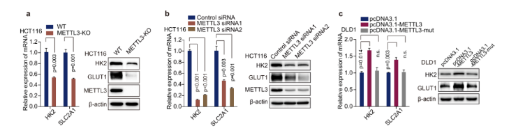 Fig3  顯示敲除 METTL3 后 HK2 和 SLC2A1 基因的表達(dá)水平降低