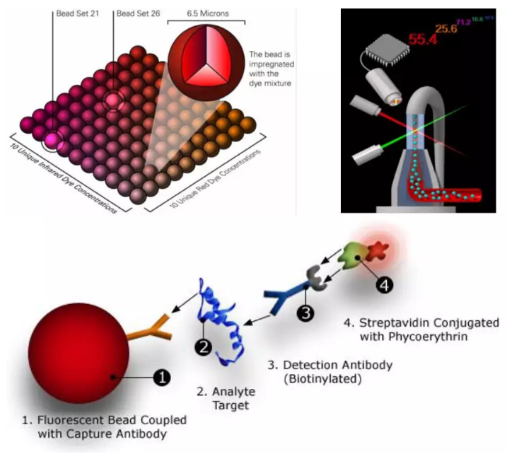 液相懸浮芯片是基于熒光編碼微球、雙激光檢測、應(yīng)用流體學(xué)等多項技術(shù),實現(xiàn)多分析物共同檢測的一種技術(shù),又稱為流式熒光技術(shù)或 xMAP(flexible Muti-Analyte Profiling)技術(shù)。