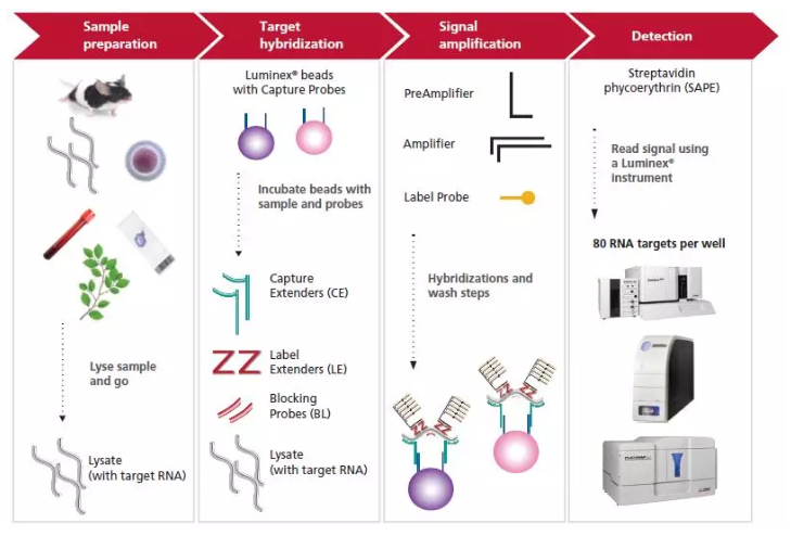 QuantiGene? Plex 高通量核酸定量研究系列產(chǎn)品是世界著名基因芯片制造商 Affymetrix 公司旗下 Panomics 的暢銷產(chǎn)品,除了利用 xMAP 技術(shù)外,還整合了西門子授權(quán)并經(jīng)過臨床驗證的 branched DNA(bDNA)技術(shù),該技術(shù)可用于 Versant HIV、HBV 以及 HCV 的病毒載量分析,通過信號放大技術(shù),而非模板放大,bDNA 技術(shù)實現(xiàn)了對模板的直接定量檢測。QuantiGene? Plex 是驗證表達(dá)譜芯片和二代測序數(shù)據(jù)、DNA 拷貝數(shù)檢測、臨床 FFPE 樣本和血液樣本的多基因檢測、信號傳導(dǎo)通路檢測以及轉(zhuǎn)化研究中生物標(biāo)志物與藥物靶點驗證研究等的理想工具。