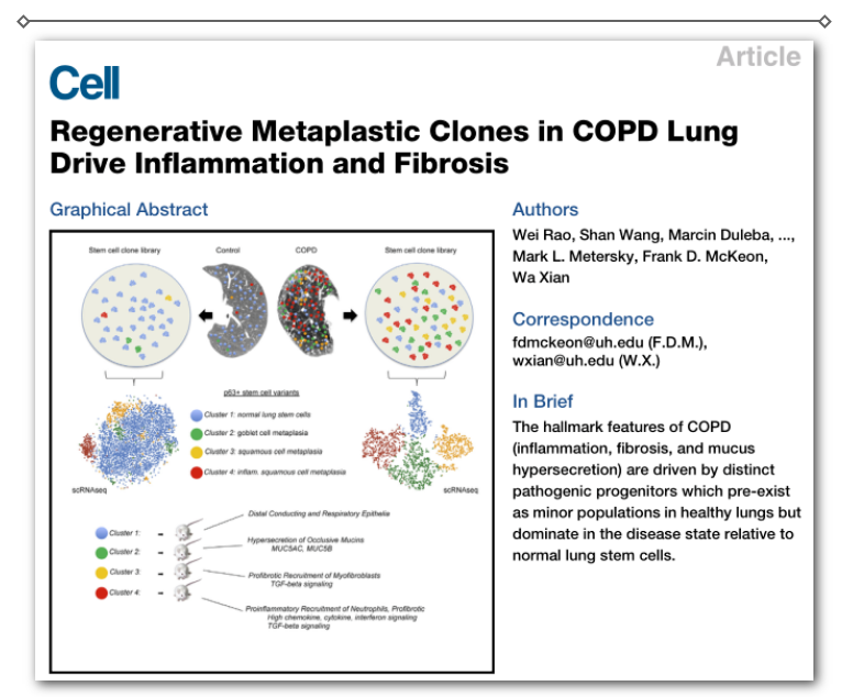 【摘要】慢性阻塞性肺?。–OPD)是一種慢性支氣管炎、小氣道阻塞和肺氣腫的進(jìn)展性疾病,是世界范圍內(nèi)的主要死亡原因。雖然炎癥、纖維化、粘液高分泌和上皮化生損傷是本病的特征,但它們的起源和依賴關(guān)系仍不清楚。本文將單細(xì)胞克隆技術(shù)應(yīng)用于 COPD 患者和非 COPD 患者的肺組織。與對照肺不同,COPD 肺由正常的遠(yuǎn)端氣道祖細(xì)胞支配,由三種不同的祖細(xì)胞浸潤,這些祖細(xì)胞在表觀遺傳學(xué)上表現(xiàn)為明顯的化生損傷。當(dāng)移植到免疫缺陷小鼠身上時,這些變異克隆引起的病理變化類似于慢性阻塞性肺病的粘膜和鱗狀上皮化生、中性粒細(xì)胞炎癥和纖維化。