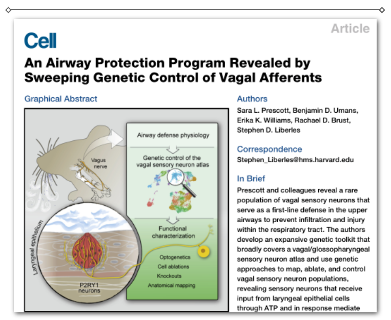 【標(biāo)題】迷走神經(jīng)傳入的遺傳控制清除揭示了氣道防御機(jī)制