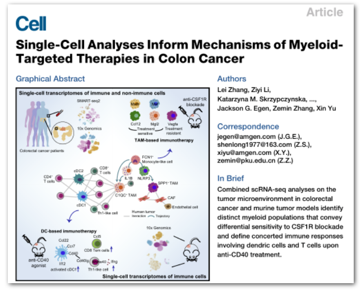 【摘要】單細(xì)胞轉(zhuǎn)錄組測序(scRNA-seq) 是鑒定腫瘤細(xì)胞多樣性的重要工具,但其在免疫調(diào)節(jié)療法機(jī)制的探索中的應(yīng)用并不多。研究者對結(jié)直腸癌患者的免疫和基質(zhì)細(xì)胞群體進(jìn)行 scRNA-seq 分析,確定特異性巨噬細(xì)胞和經(jīng)典樹突狀細(xì)胞(cDC) 亞群是腫瘤微環(huán)境中細(xì)胞互作的關(guān)鍵介質(zhì)。在小鼠腫瘤中鑒定可比較的髓樣細(xì)胞群能夠描述其對髓樣靶向免疫治療的反應(yīng)???CSF1R 治療優(yōu)先耗竭具有炎癥特征的巨噬細(xì)胞,但保留小鼠和人類表達(dá)促血管生成 / 腫瘤基因的巨噬細(xì)胞群。用 CD40 激動劑抗體治療可優(yōu)先激活 cDC 人群,增加 Bhlhe40+Th1 樣細(xì)胞和 CD8+ 記憶性 T 細(xì)胞。作者對人和小鼠的主要髓細(xì)胞亞群的綜合分析揭示了調(diào)節(jié)腫瘤免疫關(guān)鍵細(xì)胞的相互作用,并明確了目前正在進(jìn)行臨床試驗的髓細(xì)胞靶向免疫療法的機(jī)制。
