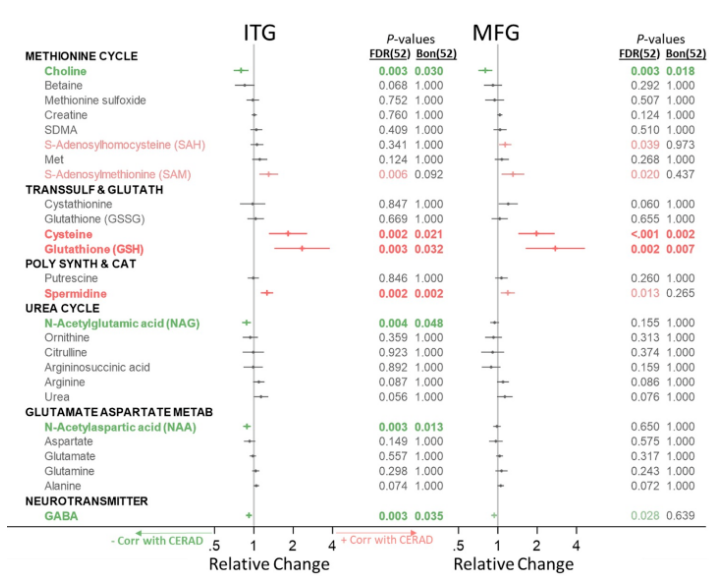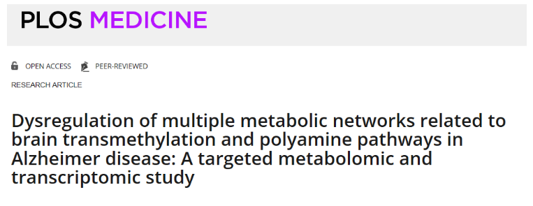 參考文獻 Uma V. Mahajan, Vijay R. Varma,et al. Dysregulation of multiple metabolic networks related to brain transmethylation and polyamine pathways in Alzheimer disease: A targeted metabolomic and transcriptomic study. PLoS Med.2020; 17(1):e1003012. Epub2020/01/14
