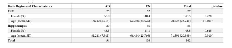 研究者采用 R -Studio1.1.453 和 STATA16.0 軟件進行分析。使用 α 值 0.05 來確定統(tǒng)計學意義。同時進行了多重比較方法 Benjamini-Hochberg 錯誤發(fā)現(xiàn)率(FDR=0.05)和 bonferoni 校正(FWER=0.05)。兩種比較方法均校正了 52 種比較(26 種代謝物×2 個主要腦部區(qū)域 ITG 和 MFG),這些比較是基于它們對不同 AD 病理的易感性而預先指定的。檢查了三組(AD,ASY 和 CN)在性別,APOEε4 攜帶者狀態(tài)(Fisherexact 試驗),年齡和驗尸間隔(PMI)(Kruskal-Wallis 測試)方面的差異樣。信息如表 2: