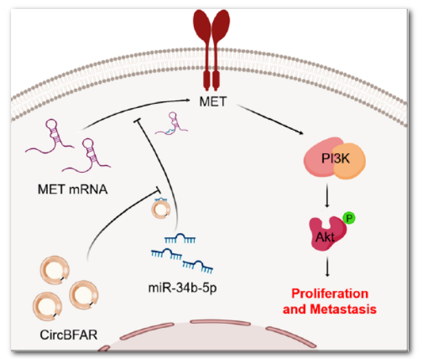 圖示:circBFAR 通過 miR-34b-5p/MET 通路促進(jìn) PDAC 增殖和轉(zhuǎn)移 的提示機(jī)制