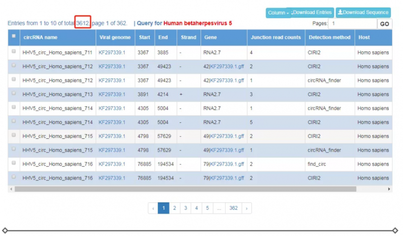 單擊相應(yīng)的病毒即可得到該病毒的 circRNA 信息,以 Human betaherpesvirus 5 病毒為例,可以搜索到 3612 個 circRNA,包括名字,病毒的基因組信息,circRNA 的位置信息,circRNA 所屬的基因 name,檢測到該 circRNA 的 junction reads 數(shù),預(yù)測出該 circRNA 的方法,以及該病毒的宿主等信息。
