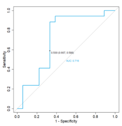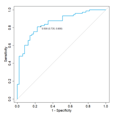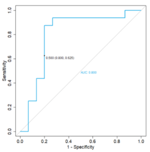 在診斷預(yù)測后,對 13 名預(yù)測診斷與風濕科醫(yī)生  zuì  初所做的診斷不同的患者進行了臨床重新評估。對于這些患者中的 4 名,仍然無法確定診斷,因為他們一直缺乏獨特的臨床參數(shù)。研究者從驗證隊列中刪除了這四個個體,重新計算了預(yù)測匹配率,增加到 71.0%,并進行了新的 ROC 分析,結(jié)果提高了敏感度(62.5%) 和特異度(80.0%)(圖 9)。