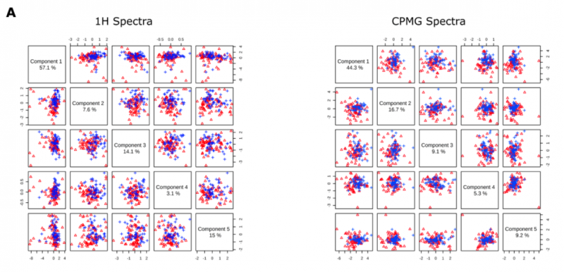對 1H 單脈沖和 CPMG NMR 光譜進行多變量統(tǒng)計分析,以確定是否存在可區(qū)分兩種疾病的特征光譜圖或峰。根據(jù)偏 zuì小二乘判別分析(PLS-DA)和隨機森林模型,臨床或人口統(tǒng)計學協(xié)變量與 1H(圖 1)和 CPMG(數(shù)據(jù)未顯示)光譜區(qū)域之間沒有顯著相關(guān)性。