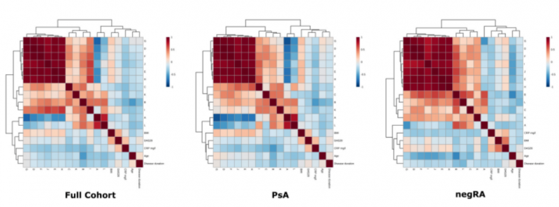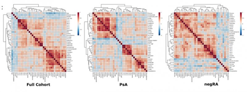 圖 2    顯示了臨床 / 人口統(tǒng)計學變量與 1H 光譜區(qū)域之間的 Pearson 相關(guān)系數(shù),以及用于發(fā)現(xiàn)隊列,PsA 和 negRA 組的歐幾里德度量的分層聚類