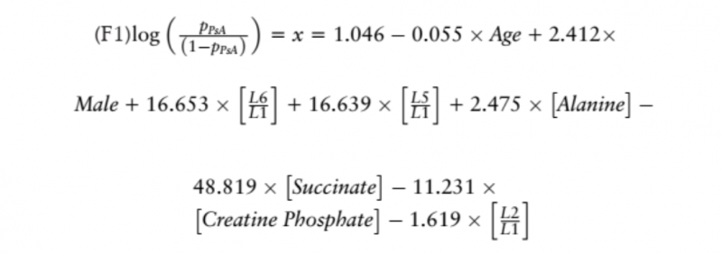 每種代謝物的濃度、年齡和性別(男性 =1,女性 =0) 代入公式中。然后,通過替換在 F1 中獲得的結(jié)果×來計算屬于 PsA 組的概率: