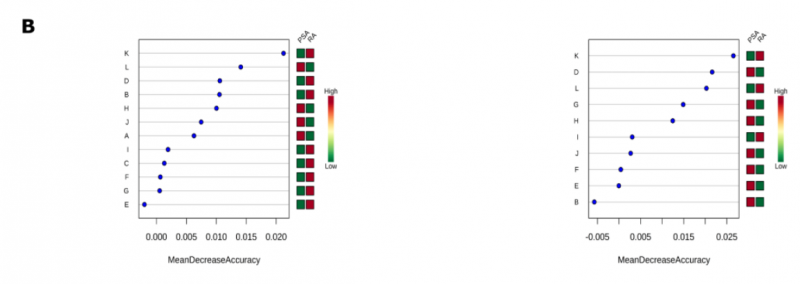 類風濕性關(guān)節(jié)炎(RA)的診斷主要基于臨床癥狀和類風濕因子(RF),抗瓜氨酸肽抗體(抗CCP)的血清學陽性,而銀屑病關(guān)節(jié)炎(PsA)只有臨床和影像學特征有助于診斷。雖然大多數(shù)RA患者RF,抗CCP血清陽性,但約15%-20%的RA病例中,血清中RF和抗CCP水平并未升高,由于血清陰性RA(negRA)和PsA的癥狀非常相似,且沒有可靠的臨床標志物,因此 ,兩者的鑒別診斷十分困難。