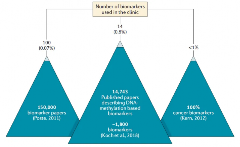 在 2003 年,Peter Laird 表達(dá)了他對(duì) DNA 甲基化生物標(biāo)志物的信心,他相信近期人們對(duì) DNA 甲基化在人類癌癥中作用的理解所取得的進(jìn)展,有一天會(huì)產(chǎn)生大量強(qiáng)有力的以 DNA 甲基化為基礎(chǔ)的生物標(biāo)記物,特別是用于癌癥診斷。這種信念是基于大量的 DNA 甲基化的變化特征,使他們有成為生物標(biāo)志物的前途:這些變化頻繁地發(fā)生在癌癥早期,容易被現(xiàn)有技術(shù)發(fā)現(xiàn),DNA 甲基化在固定的樣本中有穩(wěn)定性,各種體液和細(xì)胞類型特異性樣本中均存在。DNA 甲基化作為腫瘤標(biāo)志物已經(jīng)被大量發(fā)表。為了更準(zhǔn)確地定義這個(gè)數(shù)字,作者在 PubMed 數(shù)據(jù)庫(kù)中搜索描述 DNA 甲基化的生物標(biāo)志物的出版物。根據(jù)對(duì)這些出版物中有代表性的子集進(jìn)行人工整理,共檢索到 14,743 篇研究文章,估計(jì)有 1,800 個(gè)標(biāo)志物。然而,只有 14 個(gè)以 DNA 甲基化為基礎(chǔ)的生物標(biāo)記物目前已在市場(chǎng)上出售,共涉及 13 個(gè)基因: