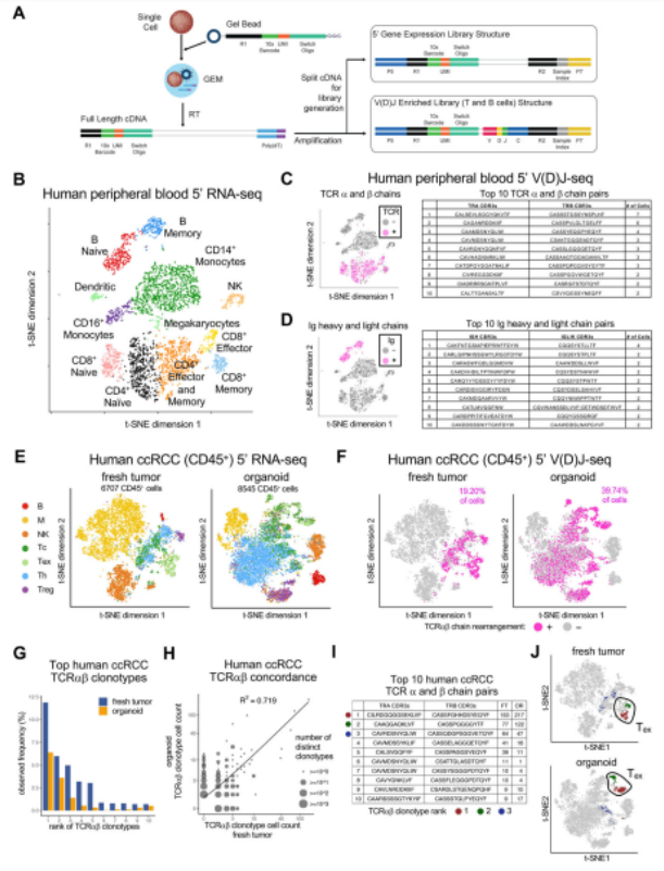 原發(fā)腫瘤上皮細胞與內(nèi)源性同系腫瘤浸潤淋巴細胞(TILs) 作為內(nèi)聚單位的共培養(yǎng)尤其難以實現(xiàn)。研究人員運用空氣 - 液體界面(ALI) 方法從 >100 個人活組織切片或小鼠腫瘤中培養(yǎng)出患者來源的器官樣體(PDOs),在具有同基因免疫能力的宿主中作為腫瘤上皮細胞,并嵌入天然免疫細胞。10X Genomics Chromium 平臺通過同時檢測基因表達及免疫組庫圖譜發(fā)現(xiàn),PDOs 腫瘤浸潤淋巴細胞準確地保留了原發(fā)腫瘤 T 細胞受體(TCR) 的圖譜。至關重要的是,人類和小鼠的 PDOs 成功地通過 anti-PD1 和 / 或 anti-PDL1 擴展和激活腫瘤抗原特異性腫瘤浸潤淋巴細胞并誘導腫瘤細胞毒性來模擬免疫檢查點阻斷(ICB)。內(nèi)源性免疫基質(zhì)與原發(fā)腫瘤上皮細胞的有機融合促進 TME 內(nèi)的免疫腫瘤學研究,并促進個性化免疫治療檢測。