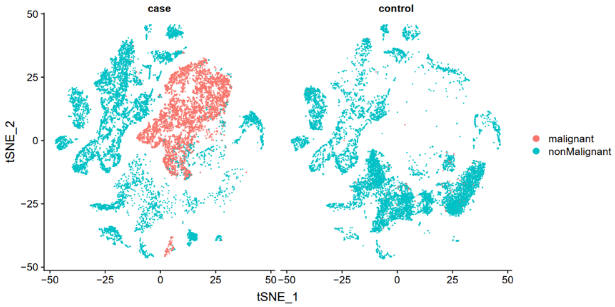 腫瘤細(xì)胞的良性惡性區(qū)分:Case 組(癌)包含較多腫瘤細(xì)胞,Control(癌旁)沒有檢測到腫瘤細(xì)胞