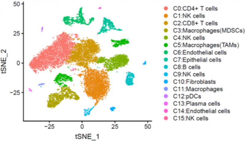 注: 從細(xì)胞注釋的結(jié)果里可以看出,這批數(shù)據(jù)主要的細(xì)胞類型包括 9 大類,其中 T 細(xì)胞、NK 細(xì)胞和巨噬細(xì)胞占大部分。同時(shí)巨噬細(xì)分還分成了單核來源的巨噬細(xì)胞(MDSC-like cells)和肝臟固有的巨噬細(xì)胞(TAM-like cells)。