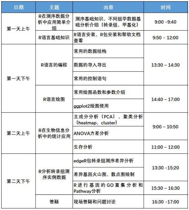 兩天時間,包含 R 語言基礎知識、R 語言編程、R 語言繪圖、R 語言統(tǒng)計分析應用、R 語言分析轉(zhuǎn)錄組數(shù)據(jù)等內(nèi)容。
