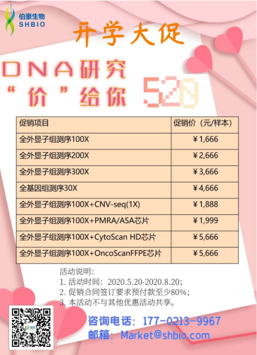 伯豪生物與您約惠 520,WES、WGS 全部底價(jià)大放送!人全外顯子測(cè)序低至 1666 元 / 樣本;人全基因組測(cè)序只要 4666 元 / 樣本;更有 DNA 研究 CP 等你 Pick!